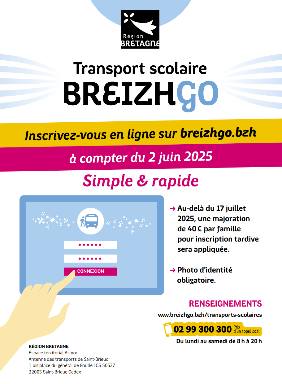L’inscription au transport scolaire sur le réseau régional BreizhGo (car, train et bateau) ouvrira le 2 juin 2025. Cette inscription se déroulera en ligne sur breizhgo.bzh (https://www.breizhgo.bzh/transport-scolaire/cotes-d-armor). La date limite d’inscription aux transports scolaires est fixée au 17 juillet 2025. Pour toute demande reçue après cette date, une majoration de 40 euros par famille sera appliquée.